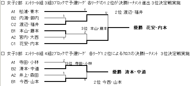□女子2部 エントリー10組 4組.3組.3組の3つのブロックの予選リーグと各リーグ1.2.3位によるクロスの決勝トーナメント