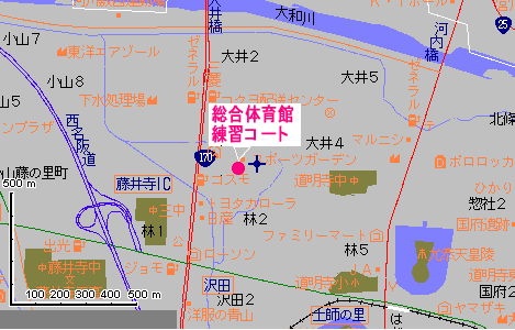 お車では、外環状線 コスモ石油の交差点を東に入るとすぐに体育館が見えます。外のコートは体育館奥にございます。
